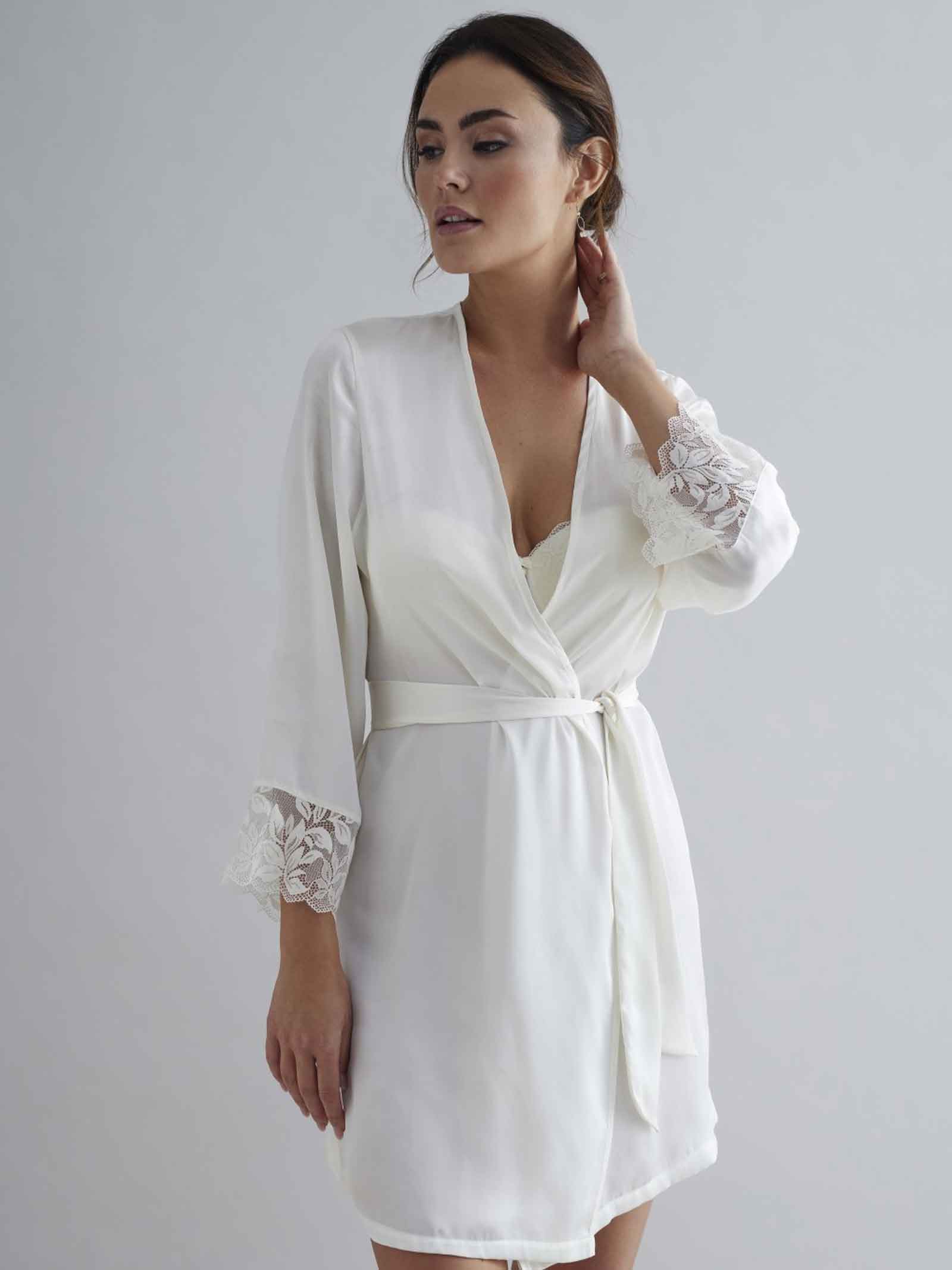 La Bata Filipa 30971 de Selmark es la elección perfecta para novias que buscan elegancia y comodidad en los momentos previos a su gran día. Confeccionada en raso suave y ligero, ofrece un tacto sedoso que envuelve la piel con delicadeza y lujo.